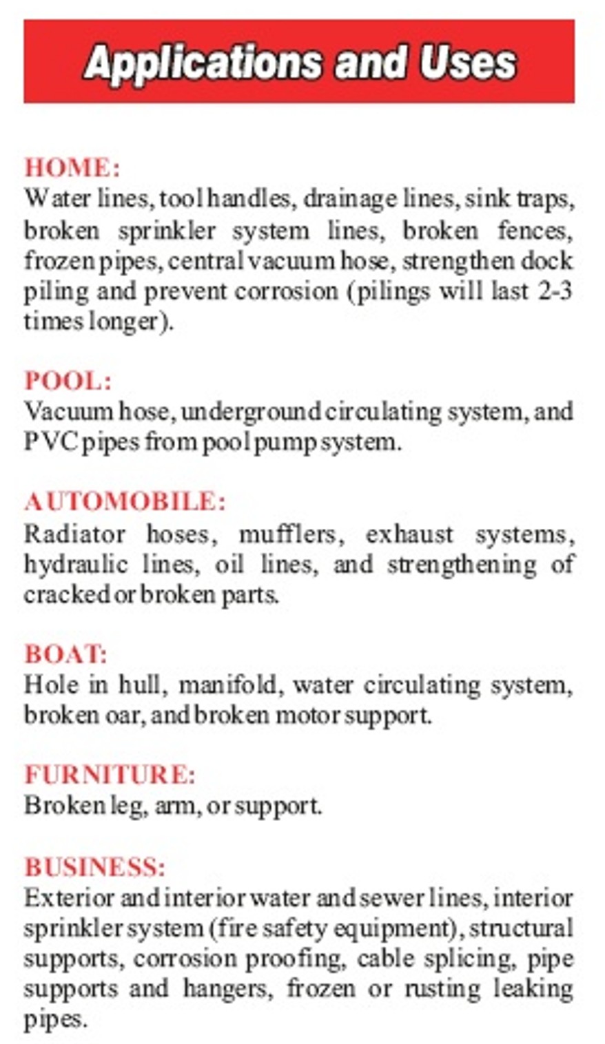 tape kits are used to repair plumbing pipes, PVC pipes, rubber and plastic tubing, fiberglass and other metallic